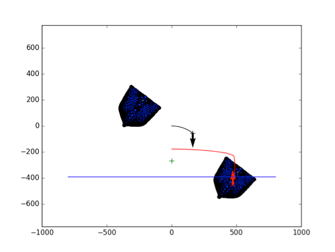 One of the key parameters our autonomous vessel needed to meet was stability and making sure that it would not flip on the ocean. We decided to create a more traditional surface vessel instead of a more exotic design such as a self-righting hull or submersible because such designs are very complex, and we thought that a better utilization of resources lay in maximizing stability. We determined that catamarans are more stable than monohulls, but the stability of our vehicle specifically had to be analyzed in order to ensure that the boat could survive the waves present in the region. When determining the stability of a boat, the center of buoyancy and the center of gravity are necessary (Figure: 1). In the figure below, the red arrow pointing up is the center of buoyancy, while the black arrow pointing down is the center of gravity.