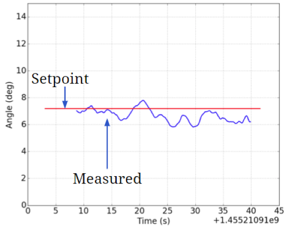 We tested our heading control going down river, up river, and across the river (i.e. cross current). All three tests gave quite similar results, with our vehicle being able to follow the desired heading accurately. The most difficult test for the vehicle was the cross current test (Figure 10), but even in this test the error from the desired angle was small (min = −0.61, RMS = 0.6, and max = 1.36).
