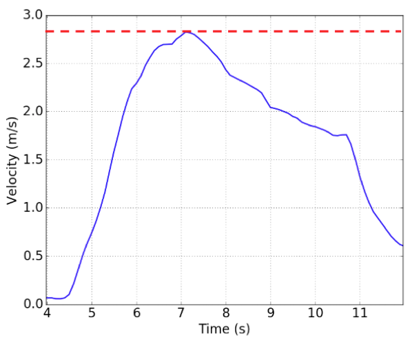 The maximum velocity of the vehicle was also tested. The desired maximum velocity is 3 m/s. In the Schuylkill, a maximum velocity of 2.88 m/s was reached (Figure 11), which is close to our desired maximum, although a little slower.