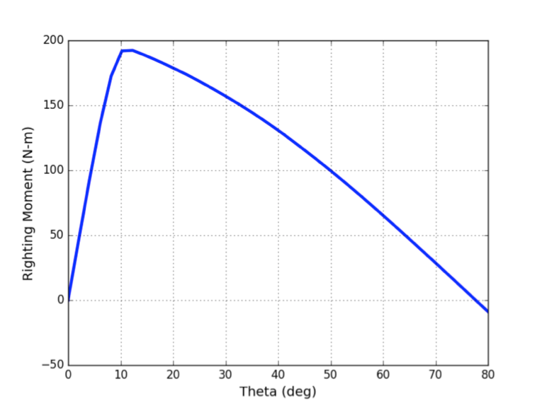 Thus, the angle necessary for stability was determined, and we had to test whether this holds true with our vehicle. This is determined by analyzing the center of gravity and the center of buoyancy in simulation (Figure 2). When the center of gravity is to the left of the center of buoyancy, the boat has a positive righting moment, but as soon as the center of buoyancy crosses the center of gravity (goes to the right of), then the righting moment is negative. We created a Python script that takes a 3D CAD model of our hulls as an input. It then iteratively calculates the center of buoyancy and center of gravity for a range of angles to determine the overall stability of the vessel. The output of the script is the righting moment as a function of roll angle as seen in Figure 2. It is clear that the catamaran has positive stability until an angle of 78.