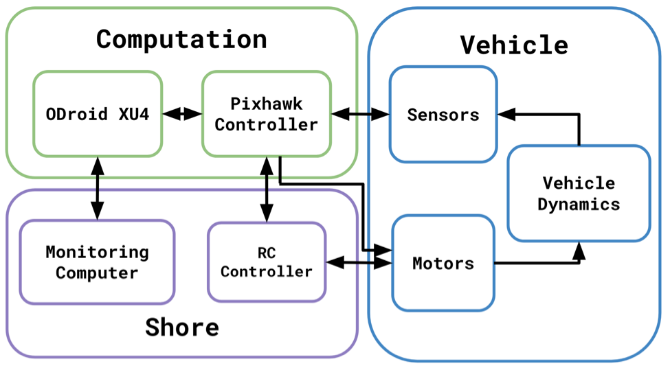 The low-level system consists of sensors and interfaces to control our actuators. The vessel has a Global Position System (GPS) receiver to determine position and an Inertial Measurement Unit (IMU) to measure angular rates and linear accelerations. The raw sensor data is sent to the Pixhawk Microcontroller where the information is fused by an Extended Kalman Filter (EKF) to combine the IMU and GPS readings into a position and orientation estimate. The vehicle also has two sensorless brushless electronic speed controllers to govern the speed of our thrusters. The Pixhawk Microcontroller is able to send motor speed setpoints via a Pulse Width Modulation (PWM) signal to the speed controller.