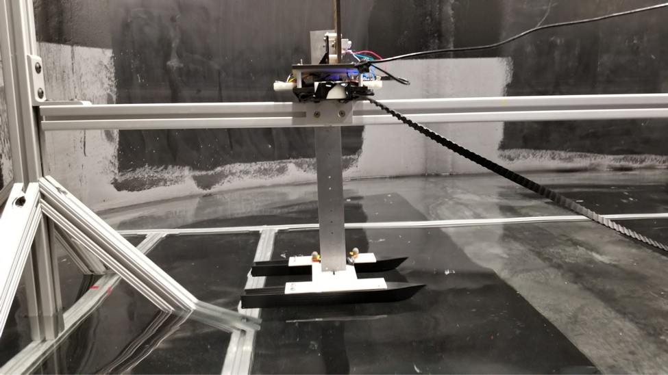 Small scale tests were done in order to compare to data from textbooks. Once the hull shape and size were determined, we scaled them down and 3D printed two hulls. These hulls were attached to a rig and dragged through water at various constant velocities and had a force sensor to measure the total drag (Figure 6). However, these tests returned highly noisy results, that we were unable to analyze with our time constraints. Thus, the textbook data was used to scale the resistance, rather than the small scale hull tests.