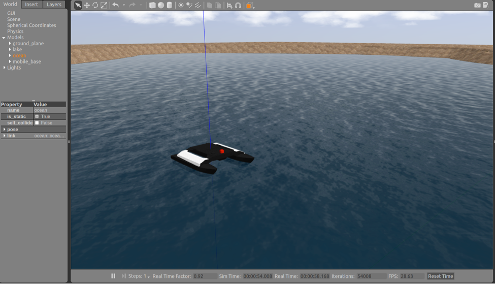 To verify the design and performance of our controllers, we used the Gazebo Simulation Environment. The simulator implements the full 6 degree of freedom dynamic model. We include interfaces in our attitude controller to send motor thrust commands to the virtual vessel and receive information from the simulated sensors as if they were on the vehicle. These interfaces allow testing of the control framework completely in simulation. With this framework, the attitude controller was tested and tuned completely in simulation prior to testing in the real world. The simulation is shown in Figure 8.