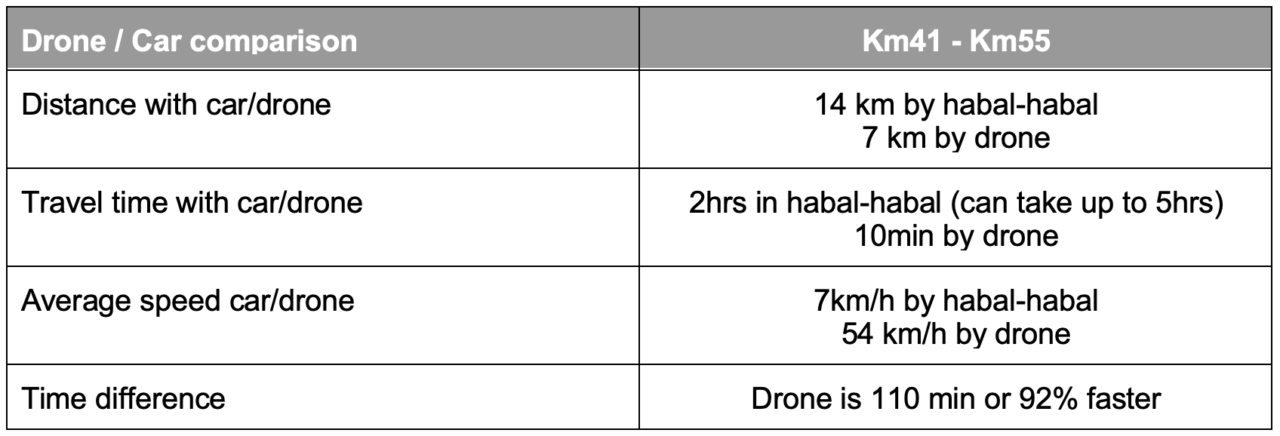 In addition to delivering medical supplies, a critical value of the cargo drone delivery was shortening the travel time. From the usual 2 hours of trip duration via habal-habal from Km. 41 to Km. 55, the trip was shortened to 9 minutes making this an excellent alternative to service delivery in this region. This is how the use of the M300 Cargo Drone compared to ground transportation: