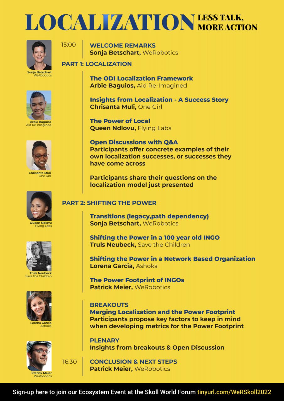 Localization is now and international organizations can reduce their Power Footprints. For the past 5+ years, 200+ proximate leaders with local organizations in 30+ countries have successfully co-created and implemented an effective, replicable and sustainable localization model. We want to share our key success factors and invite participants to share their insights on localization. We’ll highlight how the model can be adopted to expand locally-led action globally. We’ll introduce the Power Footprint concept and host breakout sessions with participants on how to develop and adopt practical metrics to measure our power footprints. By power we mean authority, control and influence. Outcomes will include a key findings position-paper and a commitment to develop adoptable metrics at follow-up event(s). Speakers will include leads from Ashoka, Re-Imagining Aid, One Girl, Flying Labs, Save the Children Sweden, and WeRobotics. Our detailed agenda is available below.
