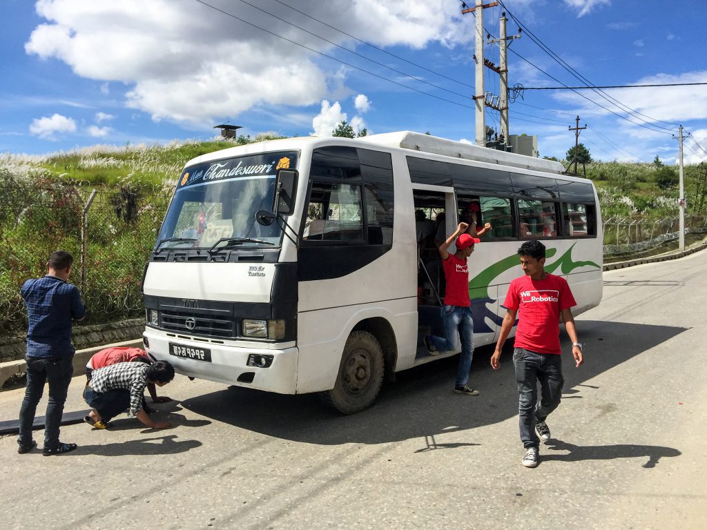 Once the hands-on training was completed it was time to put the trainees' new eBee skills to the test. We headed out to rice fields outside of Kathmandu, where students had already been flying DJI Phantom drones to create RGB basemaps. (We provided KU with training on these Phantoms last year in partnership with DJI and Pix4D; more on this here). The trip to the rice fields was not without adventure; on our way to the field the bus broke down. Luckily, it broke right beside a motorcycle repair shop, and with some basic tools, some tape and a lot of hope, we managed to get back on the road.